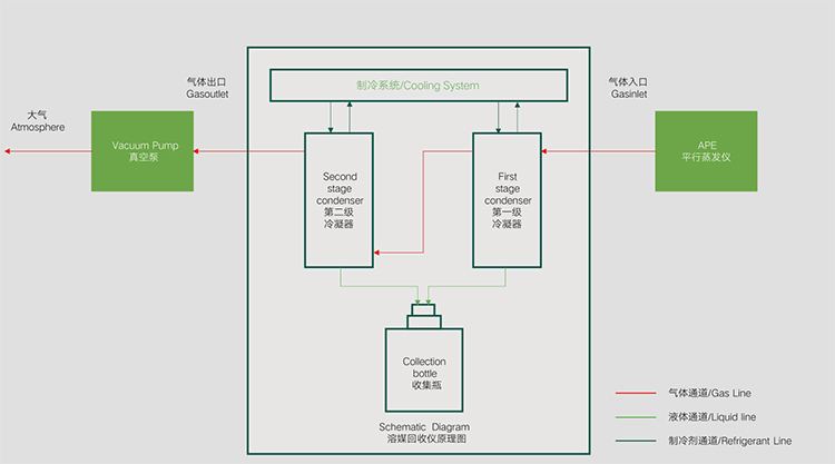 “干式”低溫冷凝——溶劑回收更高效 APE 系列不僅可以選擇傳統(tǒng)的冷卻循環(huán)水機(jī)搭配玻璃冷凝器對(duì)溶劑蒸汽進(jìn)行冷凝回收,還可以選配 eSR220S 溶媒回收儀對(duì)溶劑蒸汽進(jìn)行高效冷凝回收,溶媒回收儀采用“干式”低溫冷凝技術(shù),無(wú)需使用冷卻循環(huán)液,-20℃低溫下對(duì)溶劑蒸汽直接進(jìn)行冷凝,特別適合低沸點(diǎn)溶劑高效冷凝收集。